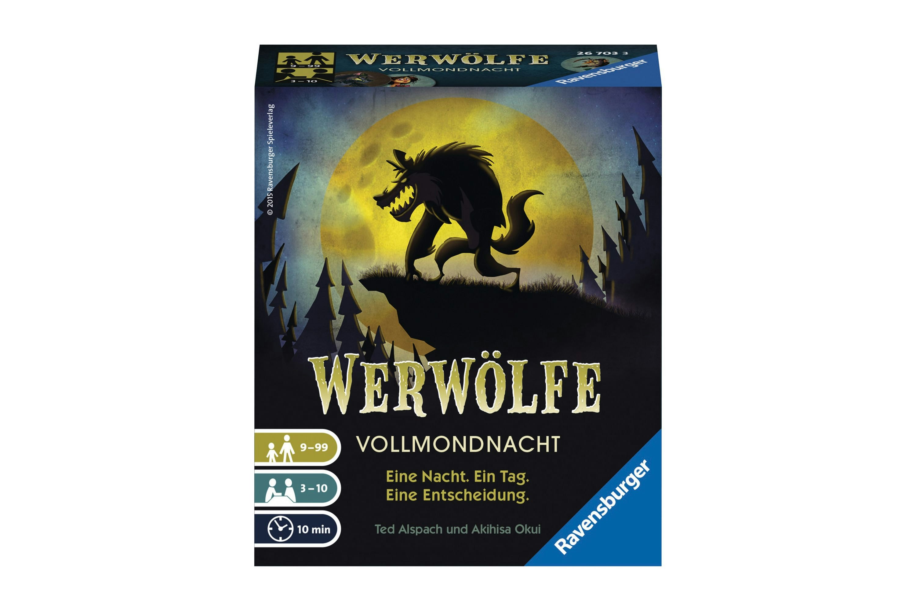 «Werwölfe: Vollmondnacht»: Autoren: Ted Alspach und Akihisa Okui, Ravensburger, ab 9 Jahren, für 3-10 Spielende, Spieldauer ca. 10 Minuten, Preis: ca. 15 Euro