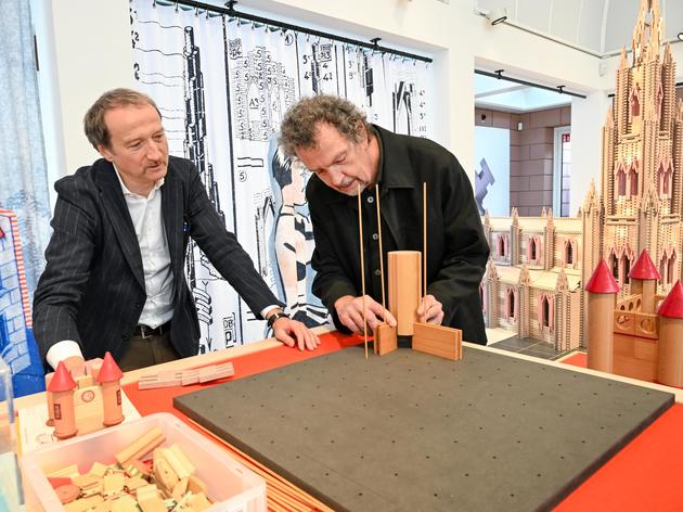Acht Stationen gibt es, an denen getüftelt, konstruiert und geplant werden kann, an vier davon mit Teilen aus Originalbaukästen der Systeme „Tetek“, „Minibrix“, „Dusyma“ und „Der kleine Großblockbaumeister“, die das Museum online aufgestöbert hat. Für vier Stationen haben Studierende der Hochschule für Technik Stuttgart Bausteine nachgebildet, und zwar im Maßstab 3:1. Deswegen ist die Kathedrale, die sich im Erdgeschoss auftürmt, auch 3,20 Meter hoch. Die filzartigen Bauelemente, die sich geschmeidig und nahtlos zusammenfügen, sind aus recycelten PET-Flaschen, erläutert Elser. Zwei Wochen hätten die Studierenden daran gearbeitet, inklusive Aufbau.