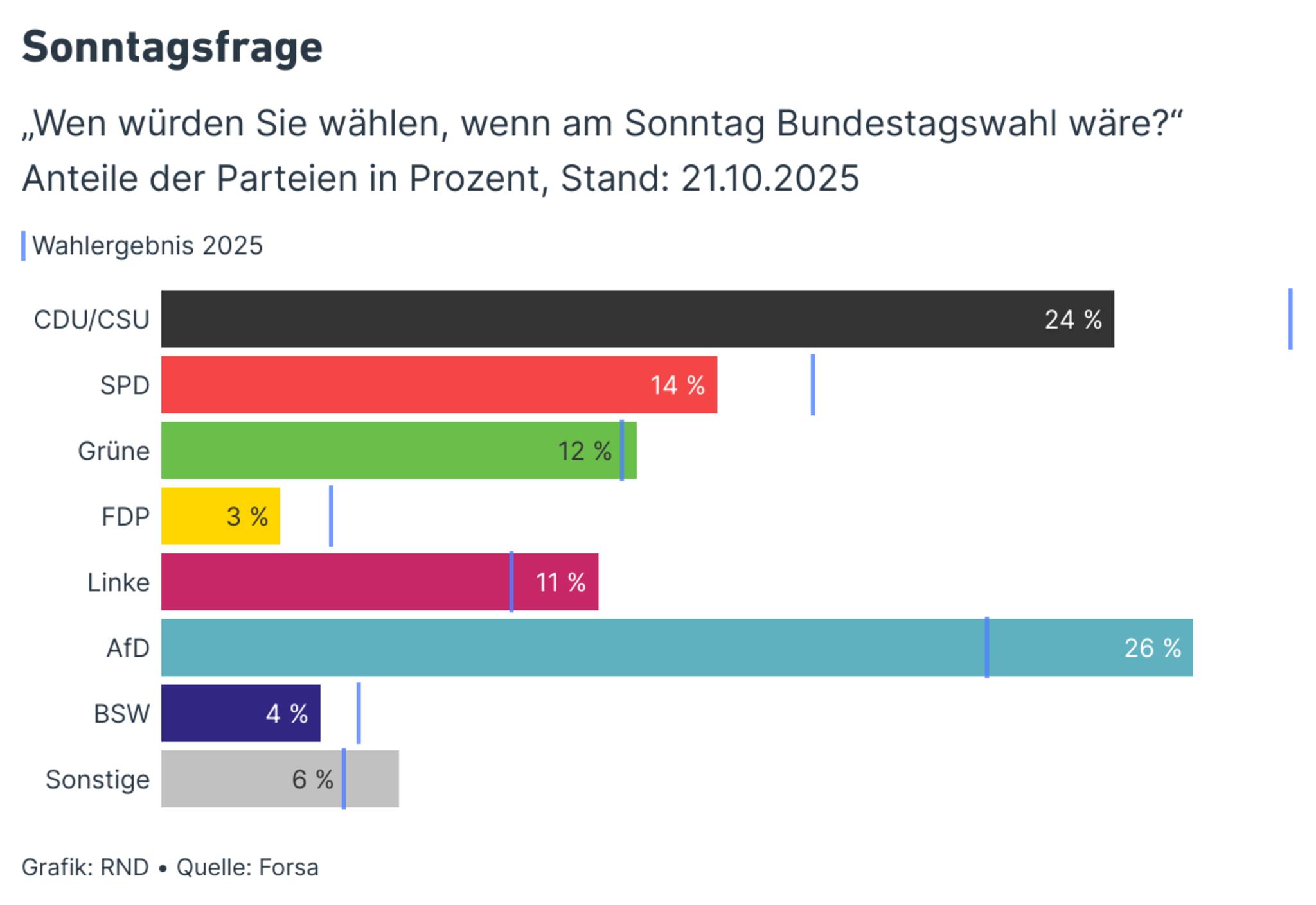 Die AfD bleibt nach einer aktuellen Erhebung des Meinungsforschungsinstituts Forsa mit 26 Prozent stärkste Kraft vor der Union mit 24 Prozent – unverändert halte aber auch eine klare Mehrheit der Wahlberechtigten die AfD für eine rechtsextremistische Bewegung gegen die Demokratie in Deutschland.