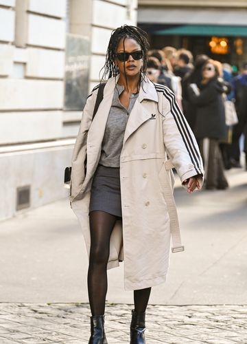 Aber auch mit einer fließenden schwarzen Anzughose und einem Turtleneck-Oberteil funktioniert der Adidas-Trenchcoat und wirkt so gleich chic.
