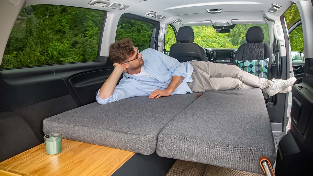 In Kombination mit der optionalen Matratze entsteht eine Liegefläche von rund 195 x 125 Zentimetern – ausreichend Platz für zwei Erwachsene und den spontanen Wochenendtrip. Ergänzend stehen Küchenmodule mit Gaskocher, Spüle und Frischwasserkanister bereit, womit der Vito endgültig in die Camperliga aufsteigt.