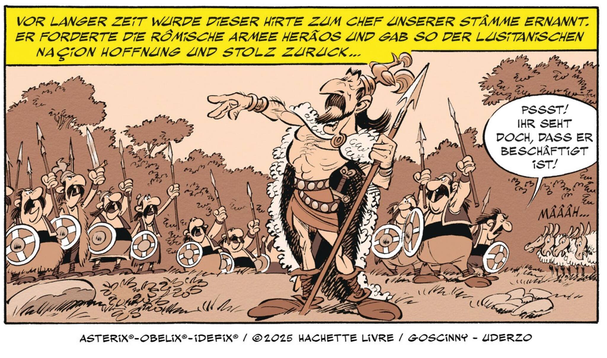 „Asterix in Lusitanien“ ist der zweite Band des Texters Fabrice Caro (Fabcaro), der mit seinem Asterix-Debüt „Die weiße Iris“ 2023 – Asterix trifft Achtsamkeit – die vergnüglichste Story des Franchise lieferte, seit 1979 das Schlusswerk des früh gestorbenen Texters René Goscinny, „Asterix bei den Belgiern“, auf den Markt kam.