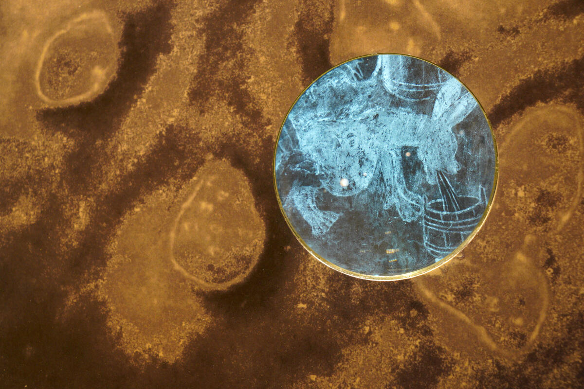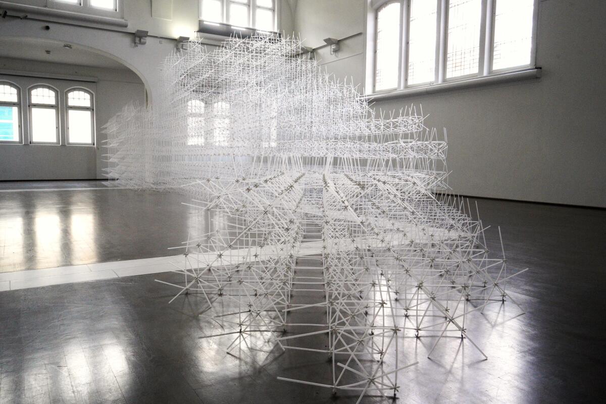 Im kleinen Wechselausstellungssaal zeigt Enya Burger ihre Installation „guided by memories“. Besucher bewegen sich durch ein Labyrinth aus Glaswänden und Kabeln, die zu kleinen Butterfässern führen, die als Lautsprecher dienen. Sie geben die Klänge wieder, die der gelbe Schleimpilz Physarum polycephalum erzeugt. „Der Einzeller erzeugt Ströme, die in Klang übersetzt werden sollen, um so noch eine klangliche Komponente miteinzubringen“, sagt Hompes. Er besitzt weder Wurzeln noch ein Nervensystem, zeigt aber trotzdem eine Form von Intelligenz. Lern- und Orientierungsvermögen ermöglichen ihm, in komplexen Systemen den kürzesten Weg zu finden – eine Fähigkeit, die auch in Wissenschaft und Stadtplanung untersucht wird.